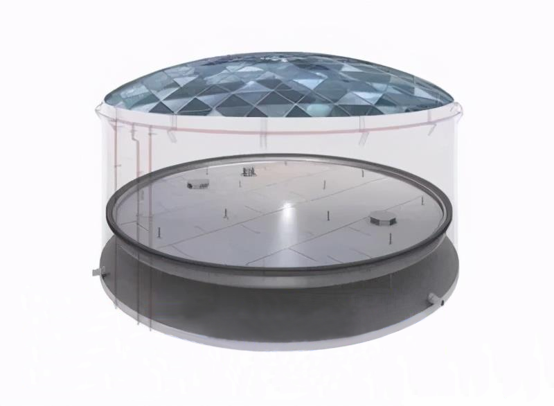 全接液內(nèi)浮盤指內(nèi)浮盤本體漂浮在液體中有一定的浸液高度,浮力單元之間及與各部件的連接部位有可靠的密封措施,形成底部全域浸入液體的內(nèi)浮盤。全浸液內(nèi)浮盤包括箱體式、浮艙式、玻璃鋼復(fù)合材料式、全焊接蜂巢芯式及其他形式的裝配式全浸液內(nèi)浮頂。全接液內(nèi)浮盤適用于儲(chǔ)罐內(nèi)直徑5m~48m。