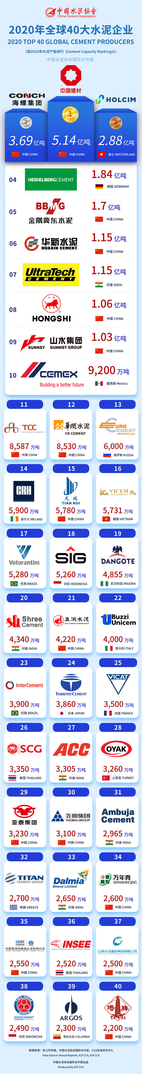 9月18日,中國水泥協(xié)會(huì)發(fā)布“2020年全球40大水泥企業(yè)”榜單,該榜單按2020年水泥產(chǎn)能排名,紅獅控股集團(tuán)以1.06億噸水泥產(chǎn)能列全球第八位、中國第五位。