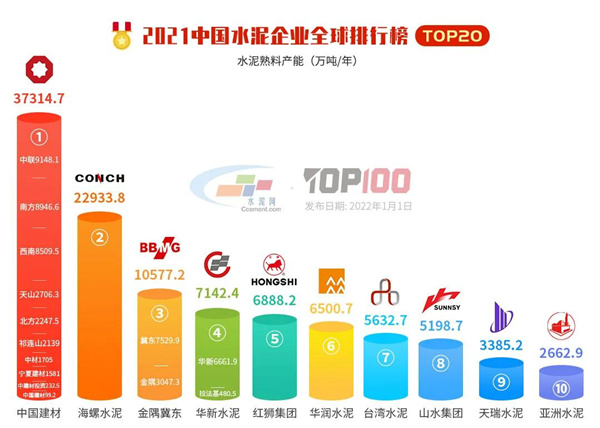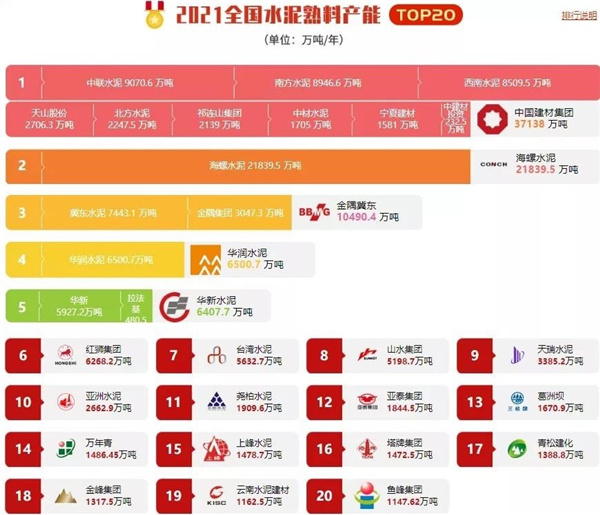 “2021全國水泥熟料產(chǎn)能百強榜”:前二十生變“2021全國水泥熟料產(chǎn)能百強榜”前十沒有出現(xiàn)變化,排名依次為:中國建材、海螺水泥、金隅冀東、華潤水泥、華新水泥、紅獅集團、臺灣水泥、山水集團、天瑞水泥、亞洲水泥。排名10-20出現(xiàn)了變化:萬年青、上峰水泥、云南水泥建材排名上升,分別為第14名、第15名、第19名。