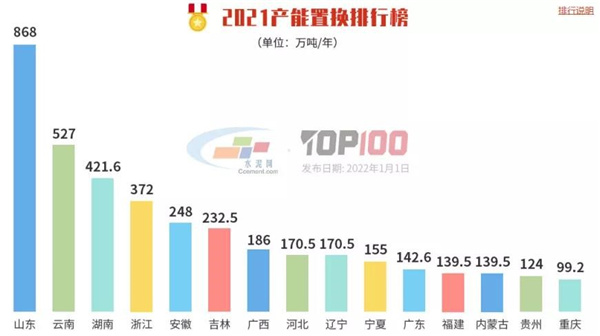 2021年置換熟料產(chǎn)能3995.9萬噸,2019年、2020年置換熟料產(chǎn)能分別為4047.2萬噸、7027.5萬噸。或受產(chǎn)能置換新政、能耗“雙控”等因素影響,2021年成為三年來置換熟料產(chǎn)能最低的一年。分省市來看,山東位列產(chǎn)能置換榜第一,其次為云南、湖南、浙江、安徽等。