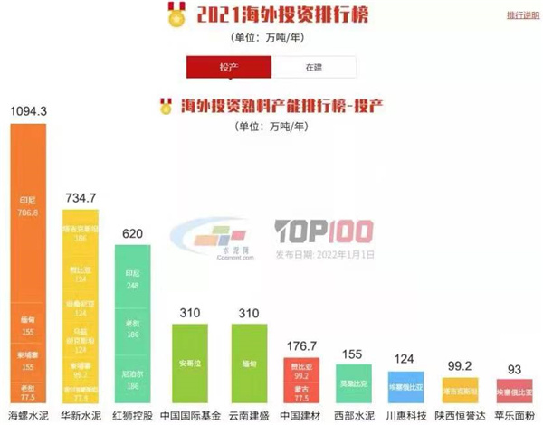 排行說明: 1、此榜單數(shù)據(jù)統(tǒng)計截至2021年12月31日中國企業(yè)在海外投資并已建成投產(chǎn)、或在建的新型干法熟料生產(chǎn)線產(chǎn)能,不統(tǒng)計其他窯型及粉磨站產(chǎn)能。2、生產(chǎn)線按設計產(chǎn)能計算:日產(chǎn)能*310天/10000(萬噸/年)。3、合資企業(yè)產(chǎn)能計入實際運營管理方。4、產(chǎn)能相同時按企業(yè)名稱拼音首字母序排列。5、此排行僅以水泥網(wǎng)收集數(shù)據(jù)統(tǒng)計,如有錯漏之處歡迎指正。