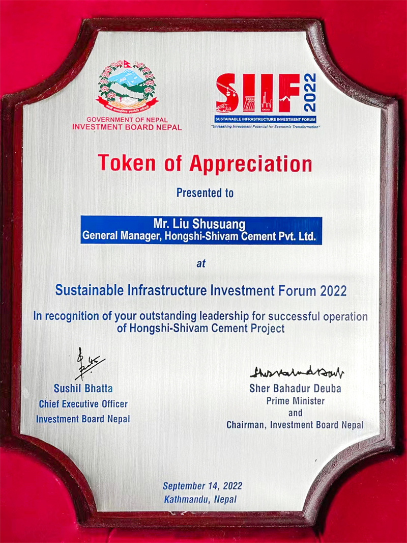 9月14日,正值中國全國人大委員長栗戰(zhàn)書訪問尼泊爾之際,由尼投資委員會主辦“2022年可持續(xù)基礎(chǔ)設(shè)施投資論壇”在加德滿都開幕。會上,尼泊爾總理德烏帕為紅獅希望水泥有限公司總經(jīng)理劉漱光頒授“杰出領(lǐng)導(dǎo)獎”,這是德烏帕總理就職二年第三次為紅獅希望頒獎。