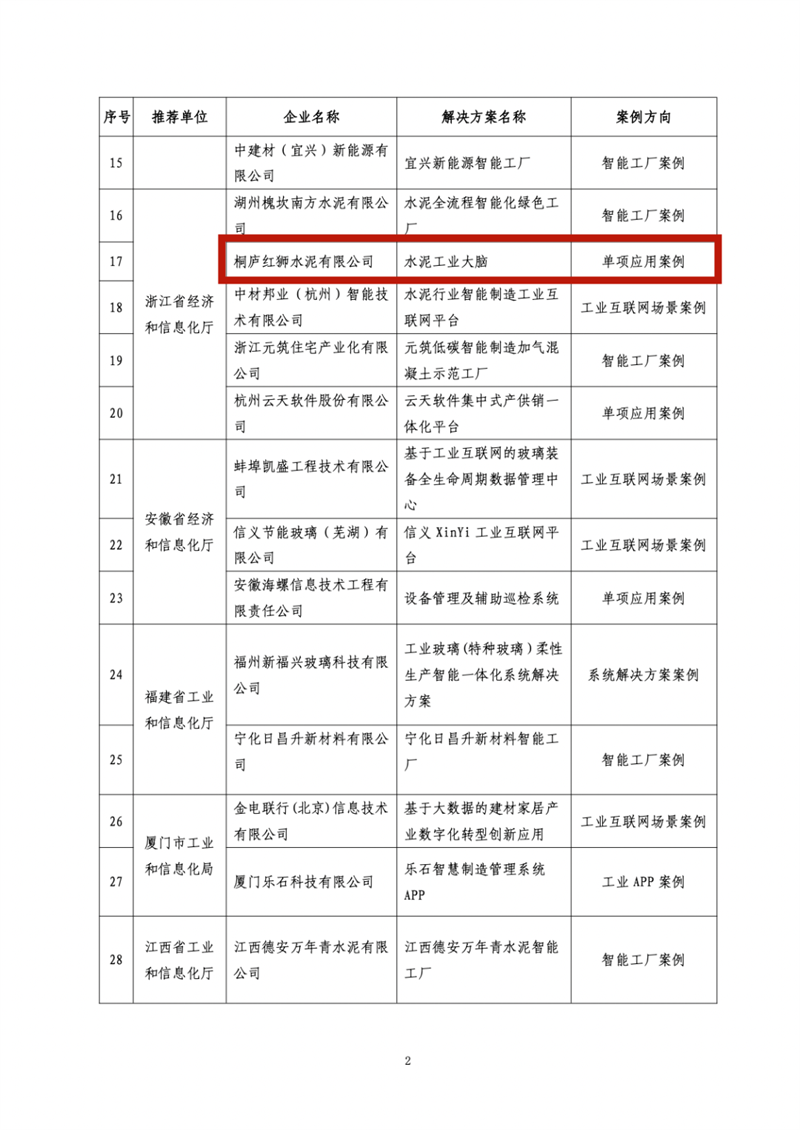 桐廬紅獅“水泥工業(yè)大腦項(xiàng)目”入選國(guó)家工信部發(fā)布的建材工業(yè)智能制造數(shù)字轉(zhuǎn)型典型案例