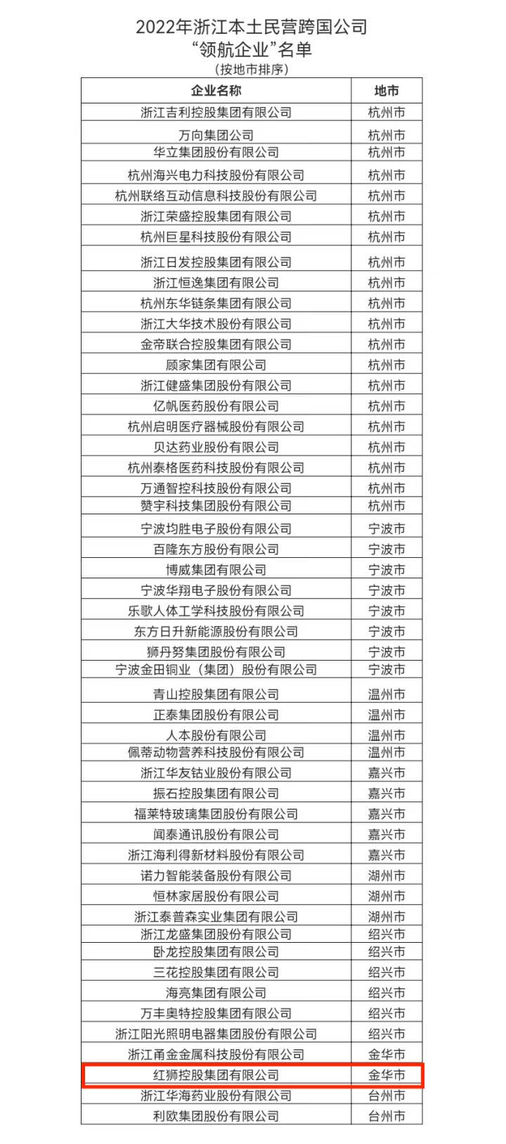 紅獅集團(tuán)入圍2022年度浙江本土民營跨國公司50家 “領(lǐng)航企業(yè)”名單