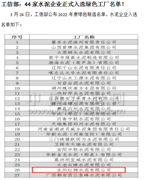 3月24日,國家工業和信息化部下發《關于公布2022年度綠色制造名單的通知》,44家水泥企業入選“綠色工廠”名單,永州紅獅為其中之一。