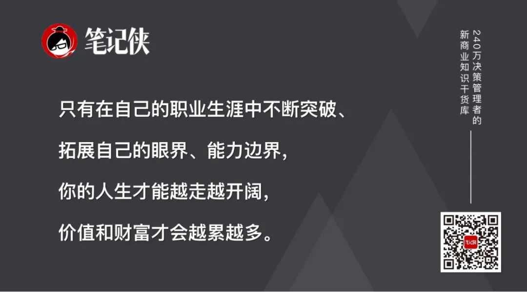 對于個人來說也是,只有在自己的職業生涯中不斷突破、拓展自己的眼界、能力邊界,你的人生才能越走越開闊,價值和財富才會越累越多。