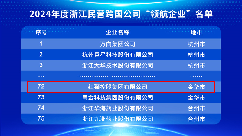 近日,浙江省商務廳公布了2024年度浙江本土民營跨國公司“領航企業(yè)”名單,紅獅集團憑借其卓越的國際競爭力和品牌影響力,再次成功入選,連續(xù)六年獲此殊榮。這一成就不僅彰顯了紅獅集團在全球市場中的地位,也體現(xiàn)了其在推動浙江乃至中國民營企業(yè)國際化進程中的重要角色。